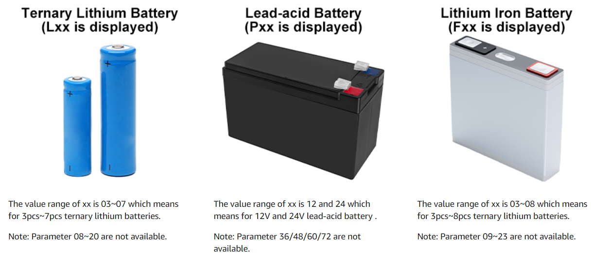 2.4>.Set to measure lead-acid battery if Pxx is displayed. The value range of xx is 12 and 24 which means for 12V and 24V lead-acid battery . Note: Parameter 36/48/60/72 are not available.