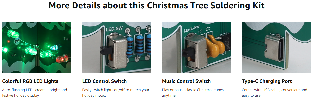 This electronic soldering project doesn't just light up — it sings! Once powered on, the built-in speaker plays cheerful Christmas melodies, adding audio fun to your soldering build.