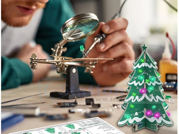 This DIY Christmas tree soldering practice kit is made by slotting two circuit boards together, forming a compact, self-supporting structure. Its smart design makes it an ideal desktop soldering project with both technical and decorative appeal. Once assembled, you will get a stable vertical display with flashing lights and music.