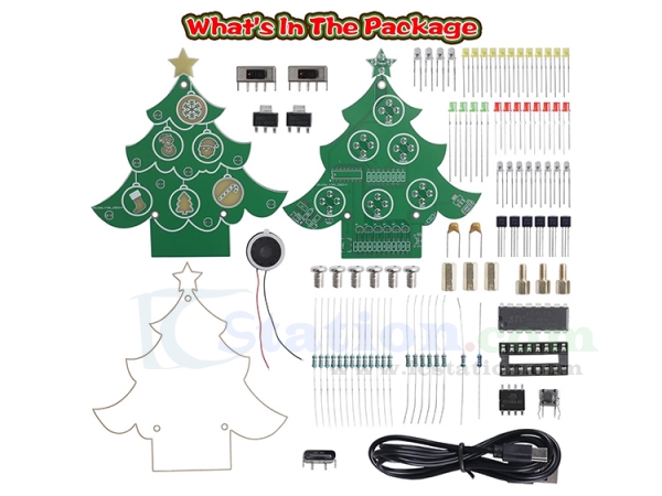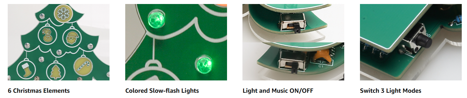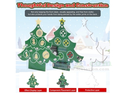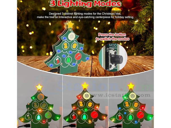 3 Lighting Modes: In addition to its decorative lighting, ICSTATION has thoughtfully designed 3 distinct lighting modes for the Christmas tree. These modes can be easily toggled using a button located at the base of the tree. Each mode brings the Christmas-themed patterns on the PCB to life in a unique way——Breathing Light Mode—Steady-On Mode——Random Flashing Mode. These lighting effects not only showcase the DIY soldering skills involved but also make the tree an interactive and eye-catching centerpiece for holiday setting.