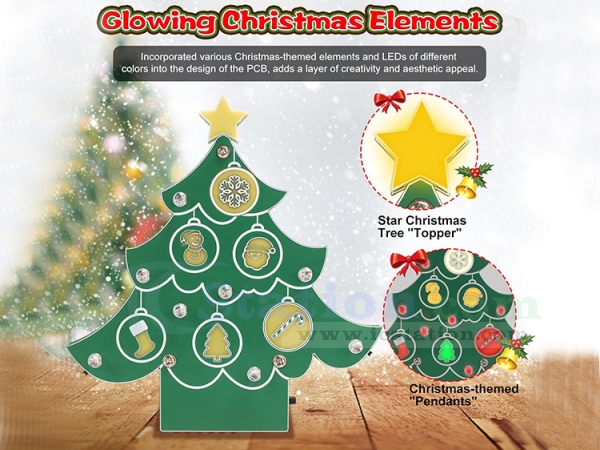Glowing Christmas Elements: To enhance the festive atmosphere, ICSTATION has incorporated various Christmas-themed elements into the design of the PCB Christmas tree. These elements—such as snowflakes, stars, Santa Claus, and Christmas stocking—are not just printed on the board but also paired with LEDs of different colors strategically placed to highlight each shape. Once powered on, the LEDs illuminate these decorations, bringing the entire tree to life with vibrant and colorful lighting effects.