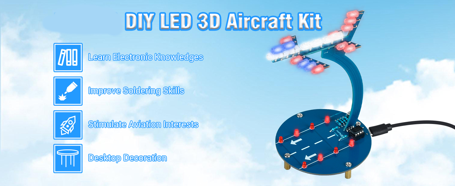 This soldering project kit features a distinctive 3D airplane-shaped design that is visually appealing. Once assembled, this LED airplane becomes a unique decorative piece. Whether placed on a desk at home or in a classroom, it adds an aviation-themed touch to the environment. It's suitable to dispaly in living room, bed room, classroom or office.