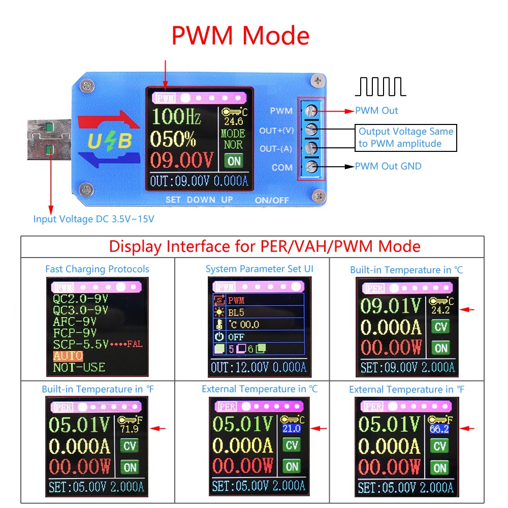 3.2>.It can display output voltage V, output current A, output power W, temperature C or F, CC/CV output mode, OVP/OCP/OPP/LVP/OEP/OPH/OAH protection mode, output ON/OFF status.