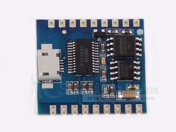 DY-SV17F is an intelligent voice module developed by the division independently. It integrates I/O subsection triggering, UART serial port control, ONE_line single bus serial port control3. Onboard 5W Class D amplifier circuit and can directly drive 4ohm 3~5W speakers. Support MP3,WAV decoding format. Max support 32Gbit(4MByte) TF card memory, can connect the computer to update TF card to store audio files via USB cable.