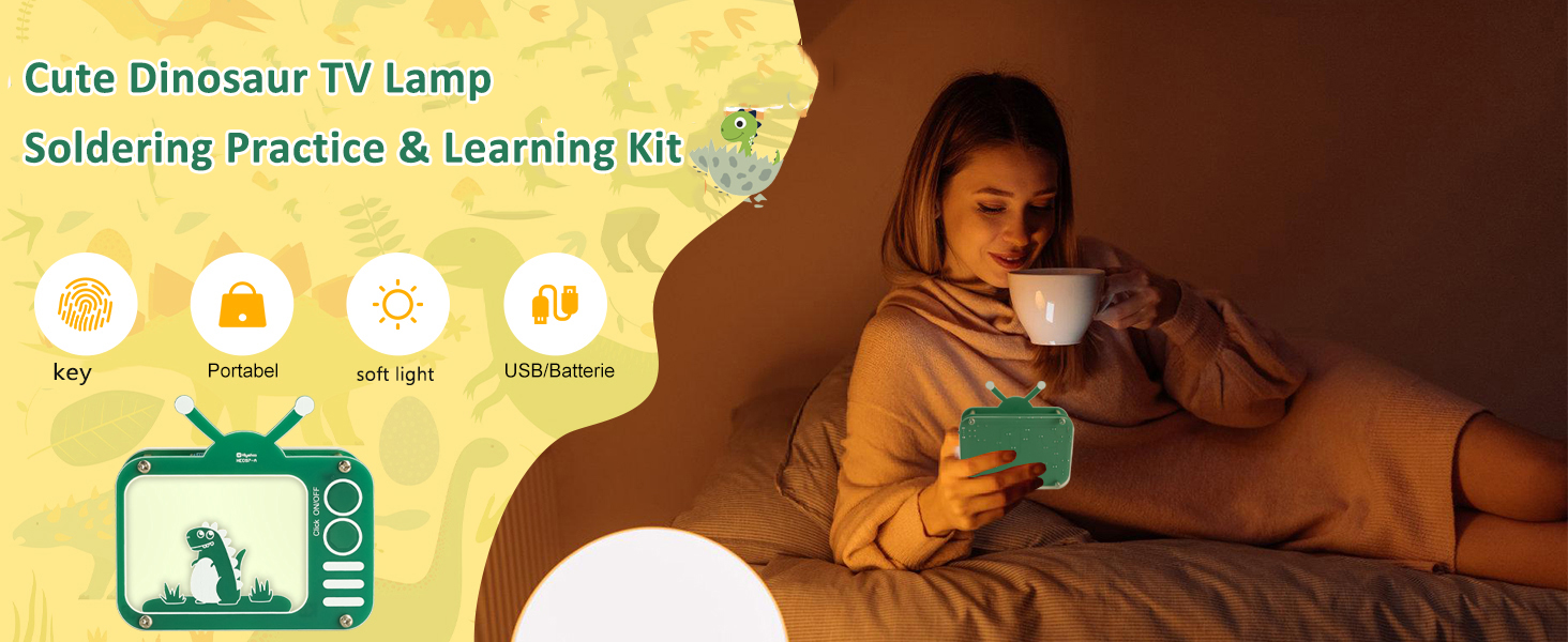 Practical soldering exercise set: learn soldering skills when building this dinosaur TV lamp. This PEMENOL kit contains all parts (circuit board, LEDs, resistors) for a complete soldering project, ideal for electronics beginners and hobby crafters.